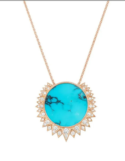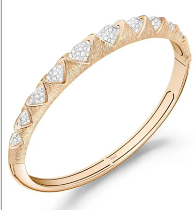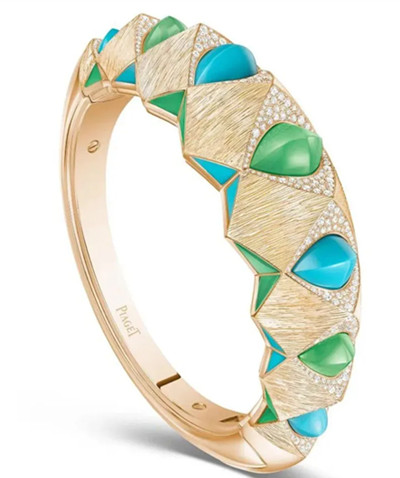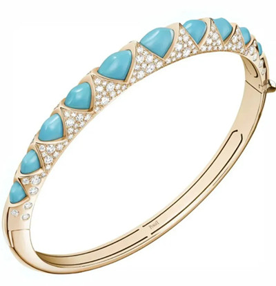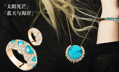 以玫瑰金塑造出立体感的几何造型,镶嵌定制切割绿松石和绿玉髓主石,清新色调让人联想到夏日的蓝天与蔚蓝海岸。