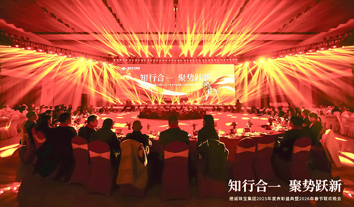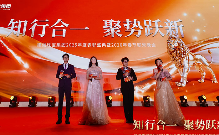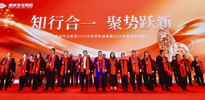 德诚珠宝集团昨晚隆重举行表彰大会暨春节联欢晚会,回顾硕果累累的2025,共启崭新征程。面对复杂多变的市场环境,集团坚持前瞻布局、深耕产品创新,精准把握消费结构转型升级趋势,以高品质黄金首饰与匠心设计赢得市场青睐,全年经营业绩再创新高。晚会现场暖意融融、掌声不断,既是对过往佳绩的致敬,更是对未来发展的期许。新的一年,德诚珠宝将继续以创新为翼、以品质为本,聚力前行,再创辉煌!