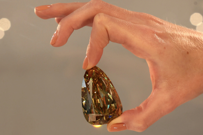 要知道,这是一颗重达303.10克拉的深彩棕黄色钻石,位列全球已知抛光钻石体量之首,还是GIA认证的第一大无瑕或内部无瑕级钻石之一。苏富比甚至夸它是“迄今发现最迷人的金色钻石”。